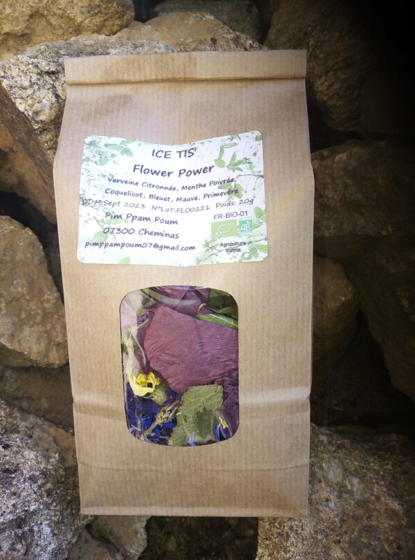 1 sachet « Ice Tis’ Flower Power » – Verveine citronnée, menthe poivrée, coquelicot, bleuet, mauve, primevère – Pim Ppam Poum de Nelly Arcet (Cheminas)