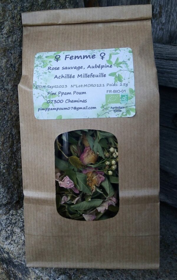 1 sachet de « Femme » – sauge officinale, rose sauvage, aubépine, achillée, millefeuille (25g) – Pim Ppam Poum de Nelly Arcet (Cheminas)