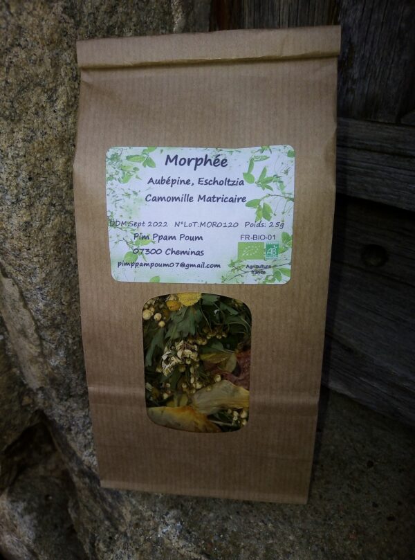 Accueil / Epicerie / Infusion Morphée Infusion Morphée6,00 € 25g quantité de Infusion Morphée Ajouter au panier Catégorie: Epicerie Description Avis (0) Description 1 sachet de « Morphée » – aubépine, escholtzia & coquelicot (25g) – Pim Ppam Poum de Nelly Arcet (Cheminas) Avis Il n’y pas encore d’avis. Soyez le premier à laisser votre avis sur “Infusion Morphée” Annuler la réponseVotre adresse e-mail ne sera pas publiée. Les champs obligatoires sont indiqués avec *Nom * Courriel * Votre note * Taux… Parfait Bon Moyen Pas mal Très mauvais Votre avis * Enregistrer mon nom, mon e-mail et mon site dans le navigateur pour mon prochain commentaire. Produits similaires Epicerie 6 Oeufs (AB) 6 oeufs - 0 + Epicerie Caviar d’aubergines Poids total : 228 g - 0 + Epicerie Coulis de tomates (herbes de Provence) 37 cl Poids total : 370 g - 0 + Epicerie Pois chiche sec (AB) 1kg Poids total : 1000 g - 0 +