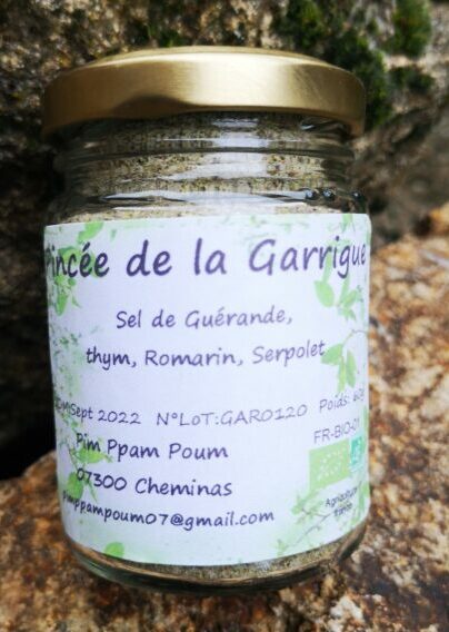 1 pot de sel « Pincée de la Garrigue » avec thym, romarin, serpolet (60g) – Pim Ppam Poum de Nelly Arcet (Cheminas)